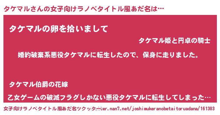 | 男性向けラノベタイトル風あだ名 | 『タケマルスレイヤー』 |