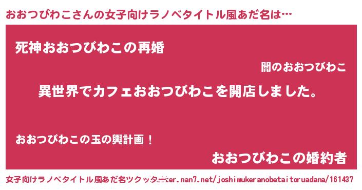| 男性向けラノベタイトル風あだ名 | 『誰もが恐れるあのおおつびわこが、ぼくの専属メイドになるようです。』 |