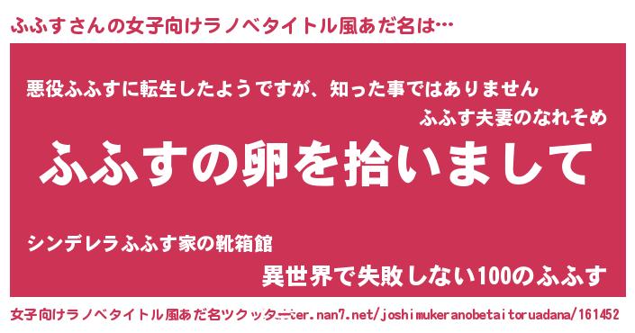 | 男性向けラノベタイトル風あだ名 | 『ふふすの嫁は女の子じゃないと思った?』 |