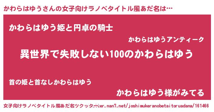 | 男性向けラノベタイトル風あだ名 | 『かわらはゆうという概念が存在しない退屈な世界 』 |
