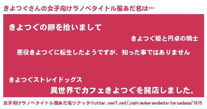 | 男性向けラノベタイトル風あだ名 | 『この素晴らしい世界にきよつぐを!』 |