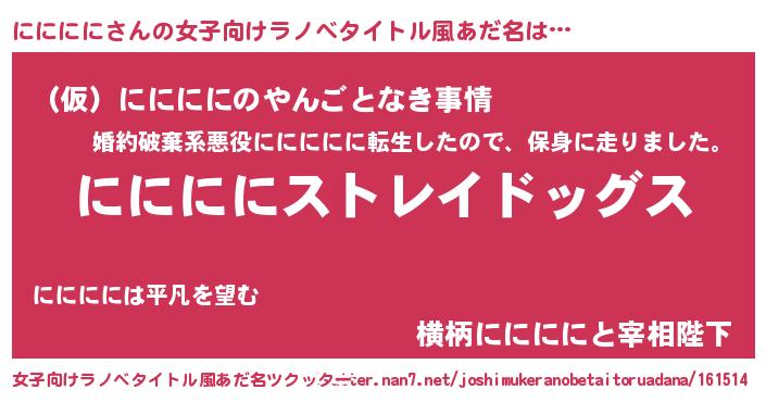 | 男性向けラノベタイトル風あだ名 | 『Re:ににににから始める異世界生活』 |