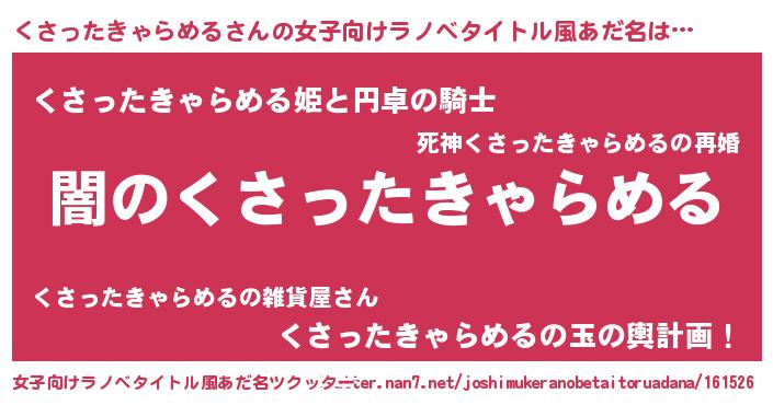 くさったきゃらめるさんの女子向けラノベタイトル風あだ名は… 『闇のくさったきゃらめる』『くさったきゃらめる姫と円卓の騎士』『くさったきゃらめるの玉の輿計画!』 ツクッター #女子向けラノベタイトル風あだ名ツクッター http://tkutter.nan7.net/joshimukeranobetaitoruadana/161526/