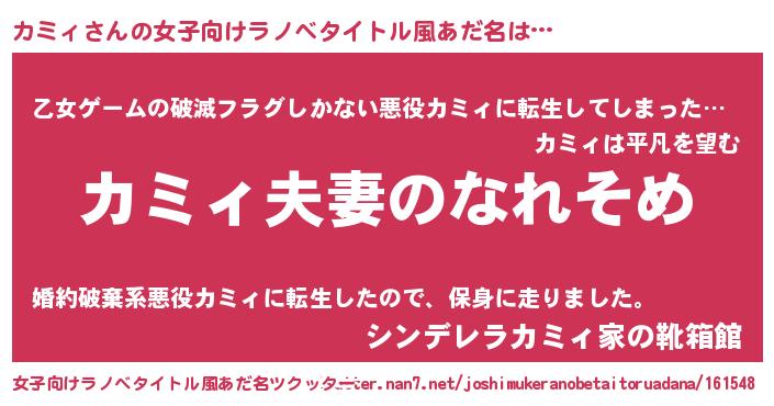 | 男性向けラノベタイトル風あだ名 | 『おまえをオタクにしてやるから、俺をカミィにしてくれ! 』 |