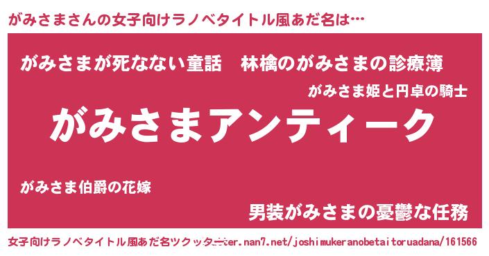 | 男性向けラノベタイトル風あだ名 | 『魔法科高校のがみさま』 |