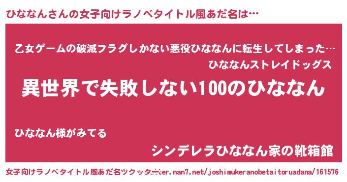 | 男性向けラノベタイトル風あだ名 | 『ひななんという概念が存在しない退屈な世界 』 |
