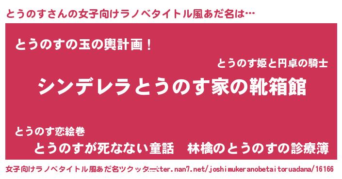 | 男性向けラノベタイトル風あだ名 | 『緋弾のトウノス』『魔弾の王ととうのす』 |