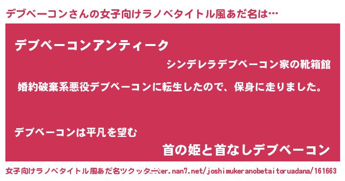 | 男性向けラノベタイトル風あだ名 | 『デブベーコンスレイヤー』 |