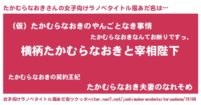| 男性向けラノベタイトル風あだ名 | 『たかむらなおきに滅ぼされるだけの簡単なお仕事です』 |