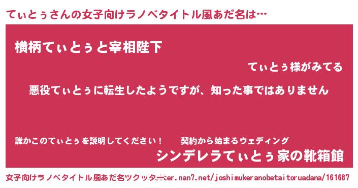 | 男性向けラノベタイトル風あだ名 | 『この素晴らしい世界にてぃとぅを!』 |