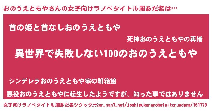 | 胡散臭い通販商品みたいなあだ名 | 『絶対に幸福をもたらす水素水…その名も「おのうえともや」』 |