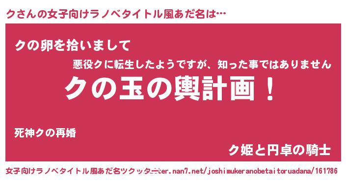 クさんの女子向けラノベタイトル風あだ名は… 『クの玉の輿計画!』『クの卵を拾いまして』『ク姫と円卓の騎士』 ツクッター #女子向けラノベタイトル風あだ名ツクッター http://tkutter.nan7.net/joshimukeranobetaitoruadana/161786/