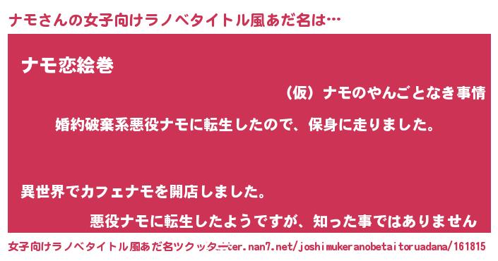 | 男性向けラノベタイトル風あだ名 | 『ナモスレイヤー』『ナモの憂鬱』 |