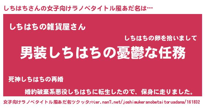 | 男性向けラノベタイトル風あだ名 | 『うちのしちはちが世界を掌握している!』 |