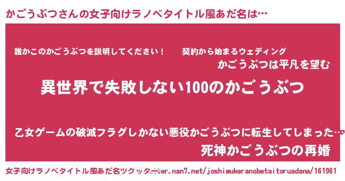 | 胡散臭い通販商品みたいなあだ名 | 『絶対に幸福をもたらす健康食品…その名も「かごうぶつ」』 |