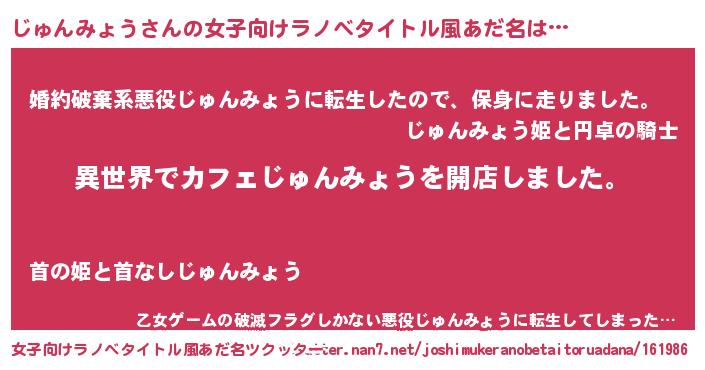 | 男性向けラノベタイトル風あだ名 | 『誰もが恐れるあのじゅんみょうが、ぼくの専属メイドになるようです。』 |