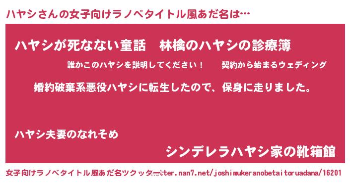 | 男性向けラノベタイトル風あだ名 | 『ハヤシスレイヤー』『魔弾の王とハヤシ』 |