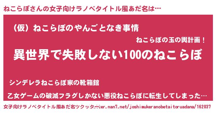 | 男性向けラノベタイトル風あだ名 | 『ねこらぼという概念が存在しない退屈な世界 』 |