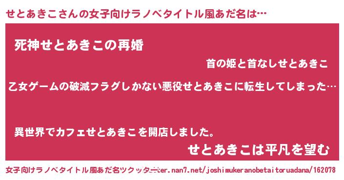 せとあきこさんの女子向けラノベタイトル風あだ名は… 『乙女ゲームの破滅フラグしかない悪役せとあきこに転生してしまった…』『死神せとあきこの再婚』『せとあきこは平凡を望む』 ツクッター #女子向けラノベタイトル風あだ名ツクッター http://tkutter.nan7.net/joshimukeranobetaitoruadana/162078/