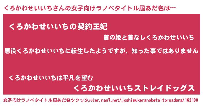 | 男性向けラノベタイトル風あだ名 | 『この素晴らしい世界にくろかわせいいちを!』 |