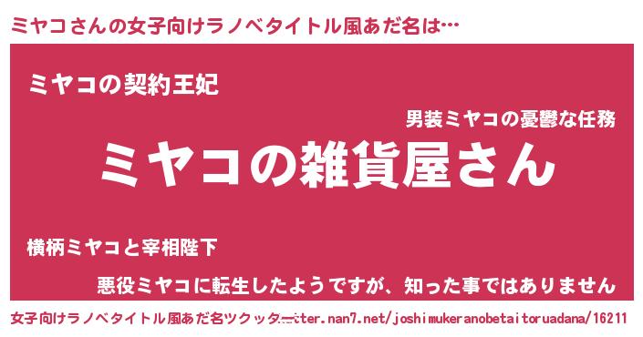 | 男性向けラノベタイトル風あだ名 | 『やはりミヤコの青春ラブコメはまちがっている 』 |