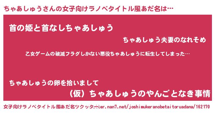 | 男性向けラノベタイトル風あだ名 | 『魔弾の王とちゃあしゅう』 |