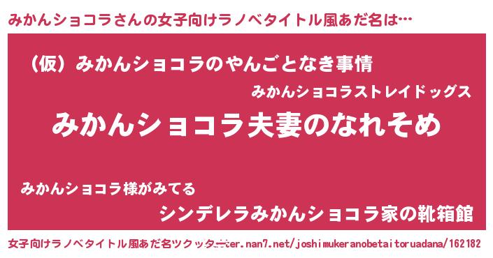 男性向けラノベタイトル風あだ名 | 『おまえをオタクにしてやるから、俺をみかんショコラにしてくれ! 』 |