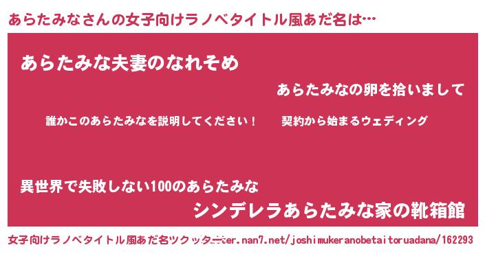 あらたみなさんの女子向けラノベタイトル風あだ名は… 『誰かこのあらたみなを説明してください! ~契約から始まるウェディング~』『あらたみな夫妻のなれそめ』『シンデレラあらたみな家の靴箱館』 ツクッター #女子向けラノベタイトル風あだ名ツクッター http://tkutter.nan7.net/joshimukeranobetaitoruadana/162293/