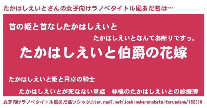 | 男性向けラノベタイトル風あだ名 | 『うちの娘の為ならば、俺はもしかしたらたかはしえいとも倒せるかもしれない。』 |