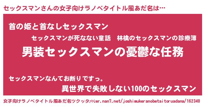 | 男性向けラノベタイトル風あだ名 | 『うちのセックスマンが世界を掌握している!』 |