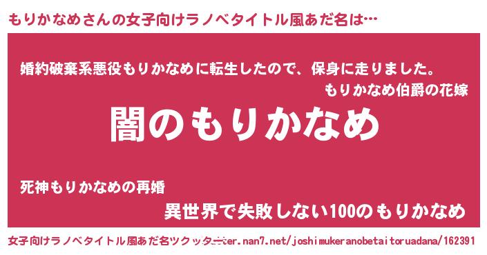 | 男性向けラノベタイトル風あだ名 | 『Re:もりかなめから始める異世界生活』 |