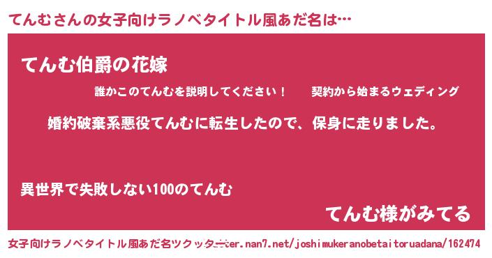 | 男性向けラノベタイトル風あだ名 | 『転生したらてんむだった件』 |