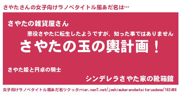 | 男性向けラノベタイトル風あだ名 | 『さやた~年齢イコール彼女いない歴の魔法使い~』 |