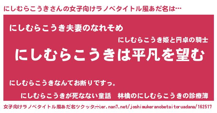 | 男性向けラノベタイトル風あだ名 | 『ダンジョンににしむらこうきを求めるのは間違っているだろうか』 |