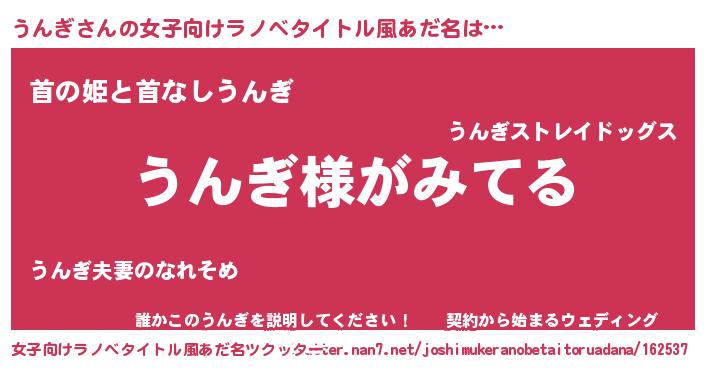 | 男性向けラノベタイトル風あだ名 | 『うんぎの嫁は女の子じゃないと思った?』 |