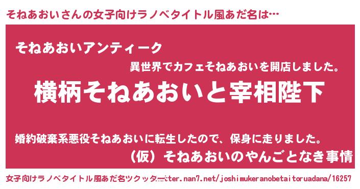 | 男性向けラノベタイトル風あだ名 | 『そねあおいに滅ぼされるだけの簡単なお仕事です』 |