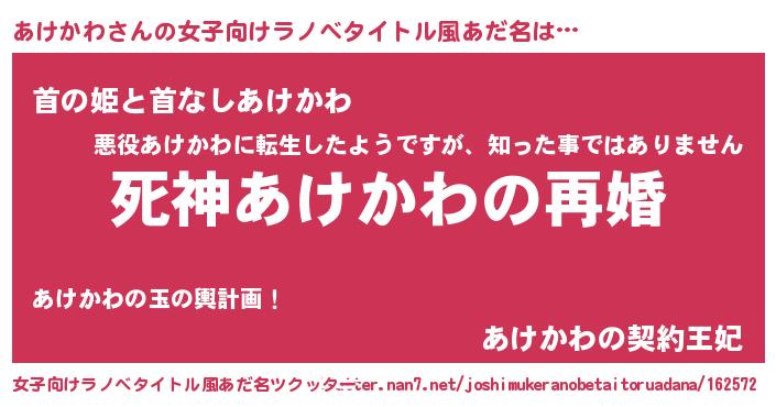 | 男性向けラノベタイトル風あだ名 | 『ノーゲーム・ノーアケカワ』 |