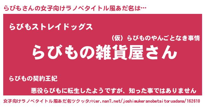| 男性向けラノベタイトル風あだ名 | 『やはりらびもの青春ラブコメはまちがっている 』 |