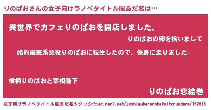 りのぱおさんの女子向けラノベタイトル風あだ名は… 『婚約破棄系悪役りのぱおに転生したので、保身に走りました。』『異世界でカフェりのぱおを開店しました。』『りのぱお恋絵巻』 ツクッター #女子向けラノベタイトル風あだ名ツクッター http://tkutter.nan7.net/joshimukeranobetaitoruadana/162615/