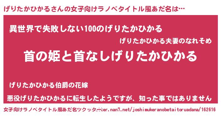 | 男性向けラノベタイトル風あだ名 | 『はたらくげりたかひかるさま!』 |