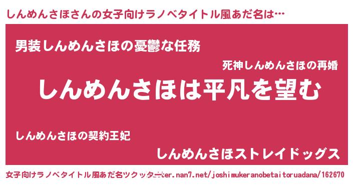 | 男性向けラノベタイトル風あだ名 | 『ダンジョンにしんめんさほを求めるのは間違っているだろうか』 |