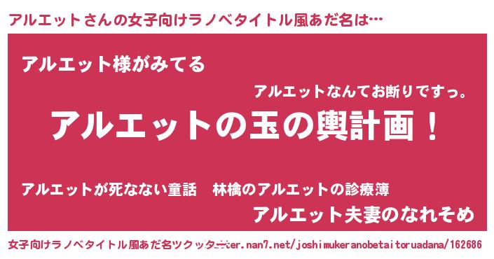 | 男性向けラノベタイトル風あだ名 | 『アルエット~年齢イコール彼女いない歴の魔法使い~』 |
