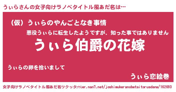 うぃらさんの女子向けラノベタイトル風あだ名は… 『うぃら伯爵の花嫁』『(仮)うぃらのやんごとなき事情』『うぃら恋絵巻』 ツクッター #女子向けラノベタイトル風あだ名ツクッター http://tkutter.nan7.net/joshimukeranobetaitoruadana/162693/
