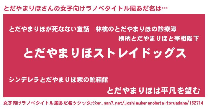 | 男性向けラノベタイトル風あだ名 | 『Re:とだやまりほから始める異世界生活』 |