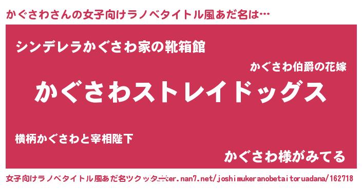 かぐさわさんの女子向けラノベタイトル風あだ名は… 『かぐさわストレイドッグス』『シンデレラかぐさわ家の靴箱館』『かぐさわ様がみてる』 ツクッター #女子向けラノベタイトル風あだ名ツクッター http://tkutter.nan7.net/joshimukeranobetaitoruadana/162718/
