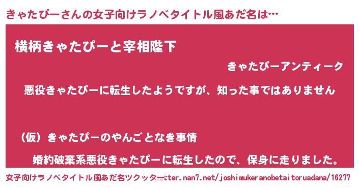 | 男性向けラノベタイトル風あだ名 | 『この素晴らしい世界にきゃたぴーを!』 |