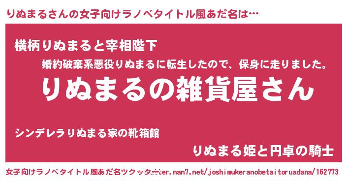 | 男性向けラノベタイトル風あだ名 | 『やはりりぬまるの青春ラブコメはまちがっている 』 |