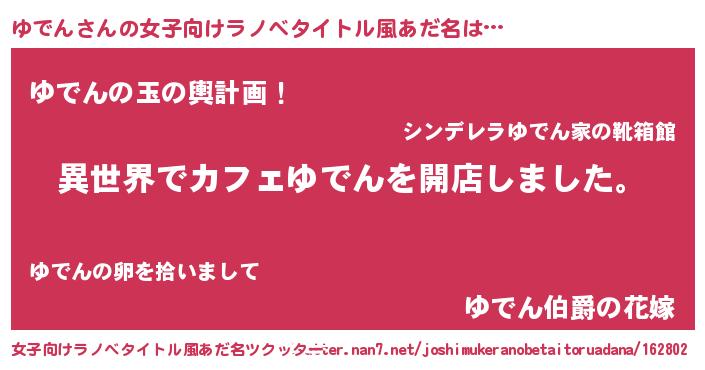 ゆでんさんの女子向けラノベタイトル風あだ名は… 『異世界でカフェゆでんを開店しました。』『ゆでんの玉の輿計画!』『ゆでん伯爵の花嫁』 ツクッター #女子向けラノベタイトル風あだ名ツクッター http://tkutter.nan7.net/joshimukeranobetaitoruadana/162802/