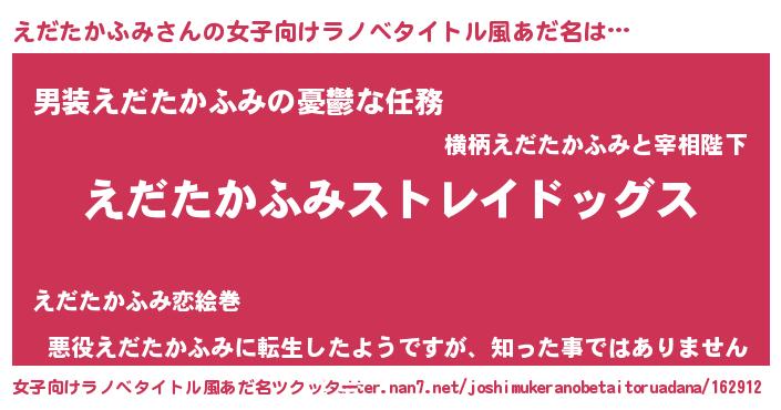 | 男性向けラノベタイトル風あだ名 | 『Re:えだたかふみから始める異世界生活』 |
