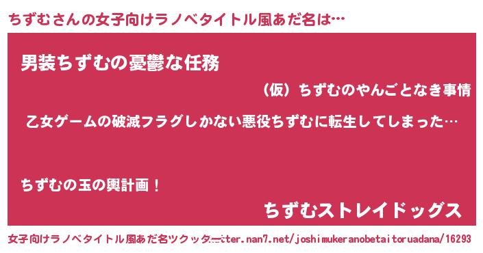 | 男性向けラノベタイトル風あだ名 | 『この素晴らしい世界にちずむを!』 |